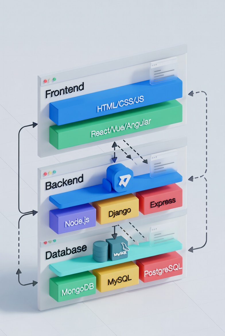 Handles data processing, authentication, business logic, and server operations. Common technologies include Node.js, .NET Core, Java, and PHP.Database: